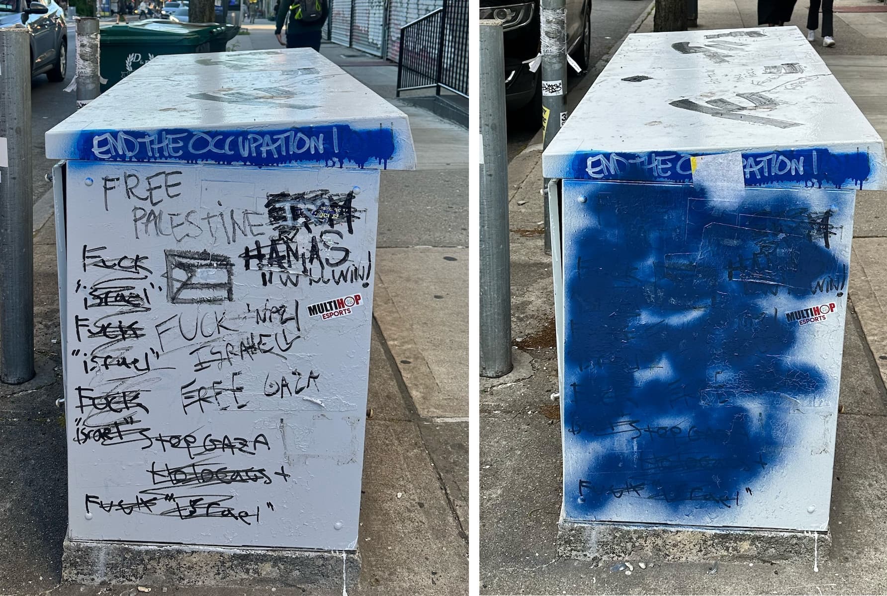 But these markings are in flux; pro-Israel detractors regularly erase, deface, and write over them. On the electrical box, Free Palestine appears in black Sharpie. By evening, from Hamas is scrawled beneath it. Soon after, both messages are sprayed over, leaving only marks—a redaction of resistance. No More Genocide later reasserts itself, sometimes in the same handwriting, sometimes in a different hand. Elsewhere, Free Gaza becomes Free Gaza Hostages.