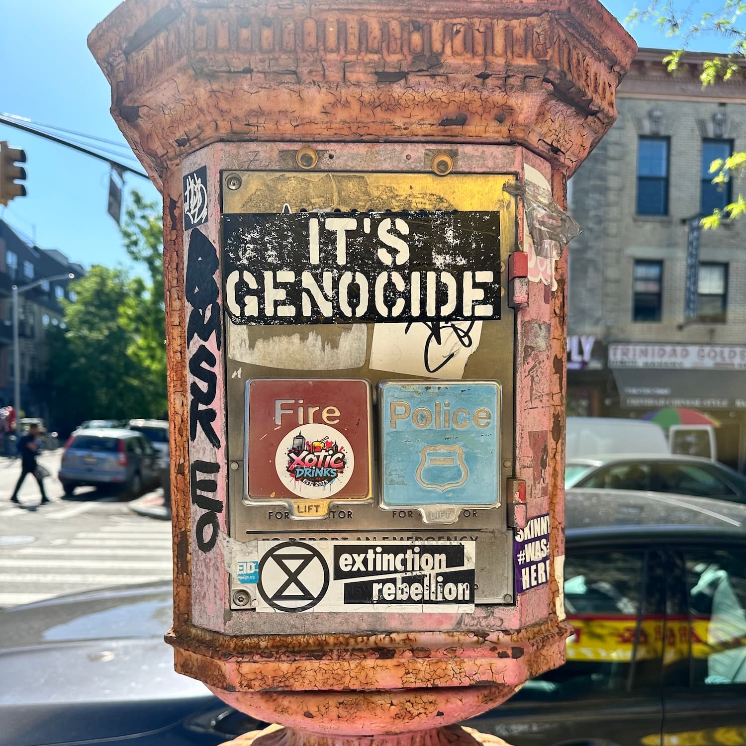 The murmurs do continue elsewhere on Nostrand, though, and so too does the defacement. We owe Gaza Endurance, reads one. Stickers declaring It’s Genocide have been particularly stubborn, despite the scrapers.